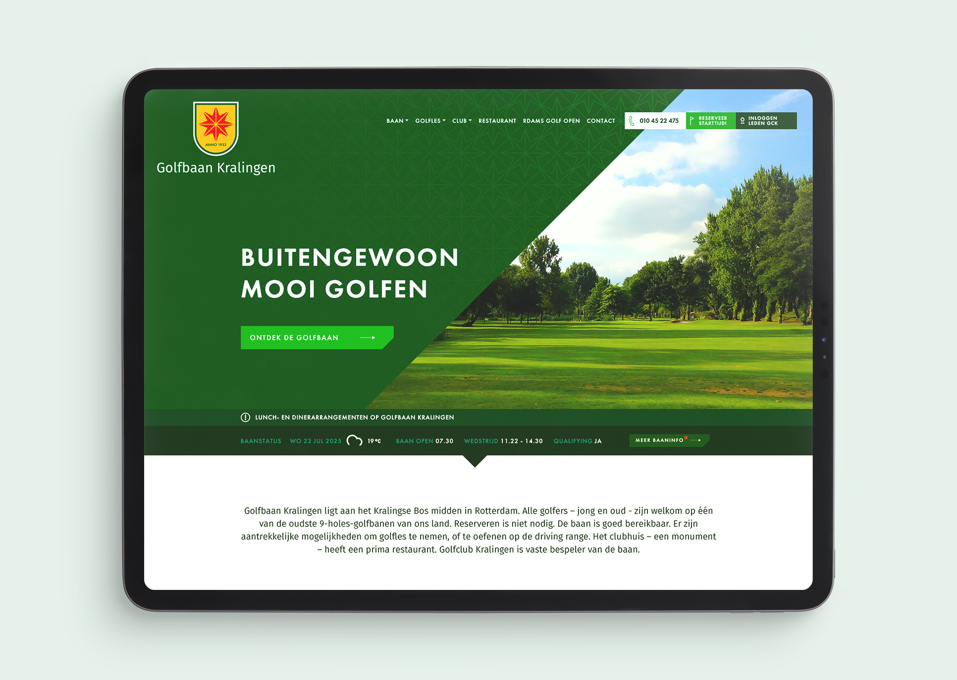 Golfbaan Kralingen heeft een prachtige ligging in het hart van het Kralingse Bos in Rotterdam. Het is misschien wel de kortste A-status baan van Nederland, maar met smalle fairways en veel waterhindernissen blijft het een baan die golfers van elk niveau uitdaagt. Alle golfers – jong en oud – zijn meer dan welkom om te komen spelen op één van de oudste en meest karakteristieke 9-holes-golfbanen van Nederland.